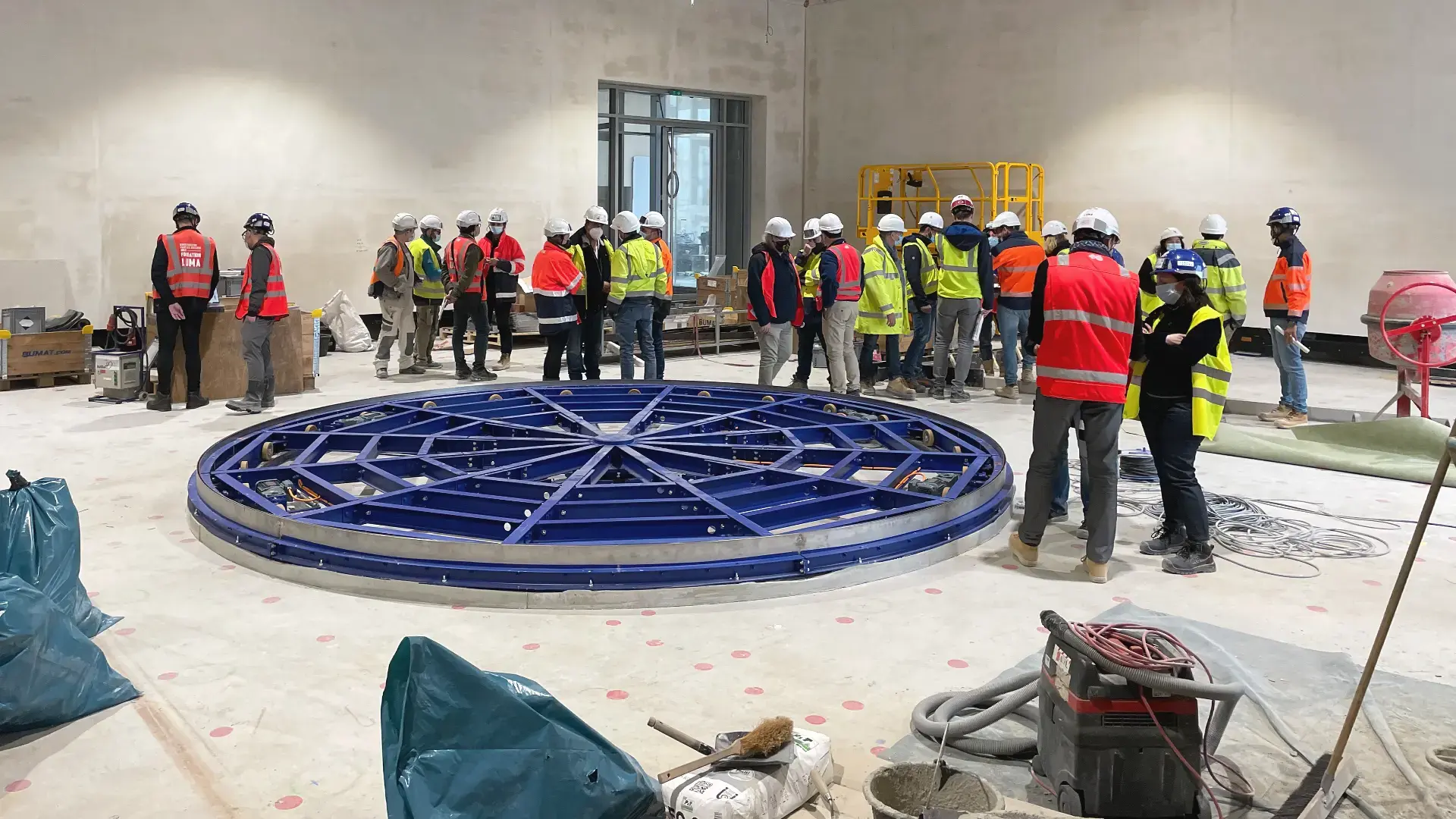 While the focus of this installation seems to be his film-of-films, there is more going on here. The artist’s passion for automatons meant investing the space with interconnected acts of machinery; the water basin holding the sonic lilies, the turntable rotating the bleacher seating, the steel structure suspending the LED screen, the air conditioning unit blowing from behind the mirror-polished shutters, the ceiling tracks moving the faceted speaker, the oversized textile wall panels absorbing sound. All of these were coordinated so the entire room would function as a complex machine in unison with the film.
